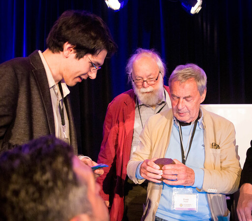 A picture of David Singmaster (middle), looking together with Lucas Garron at Ernő Rubik, who is holding a replica of Rubik's original prototype by Tony Fisher.