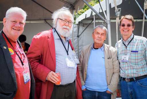 A picture of David Singmaster (second from the left), with Neil Calkin, Ernő Rubik, and Tom Rokicki.